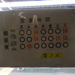 | 営業時間 | 2025年6月~ (月)6:00〜9:00、11:30〜13:30、22:00〜翌5:00 (火)6:00〜9:00、11:30〜13:30 (水)22:00〜翌5:00 (木)6:00〜9:00、11:30〜13:30、22:00〜翌5:00 (金)6:00〜9:00、11:30〜13:30、22:00〜翌5:00 (土)6:00〜9:00、22:00〜翌5:00 (日)22:00〜翌5:00 |