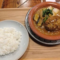 | メニュー | 塩麹ハンバーグとたっぷり野菜のスパイスカレー煮込み:1350円 |