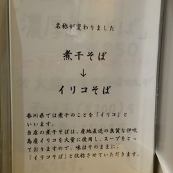 | 備考 | 1)中華そばのストレート細麺と、イリコそばの手もみ平打ち麺は、相互に変更可能。 2)煮干そば→イリコそばに、名称が変わりました。店内POPよれば、香川県では煮干をイリコといい、産地直送の伊吹産イリコを使っているためとのこと。 紙エプロン有り 2022.4.13建物取り壊しによる移転のため閉業 |