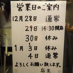 | 営業時間 | 11:00~15:00/18:30~23:00(L.O.22:00) [月] 11:00~15:00 [土] 11:30~15:00 ※材料がなくなり次第終了 |
